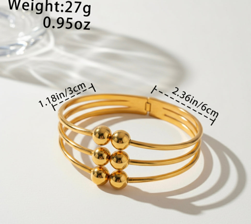 The Three-Row Sphere Bangle delivers a sleek, architectural statement. This hinged bangle features three smooth, parallel bands clustered with perfectly polished golden spheres at the center. The combination of clean lines and bold geometry creates a contemporary and luxurious feel.
