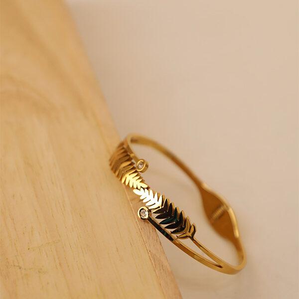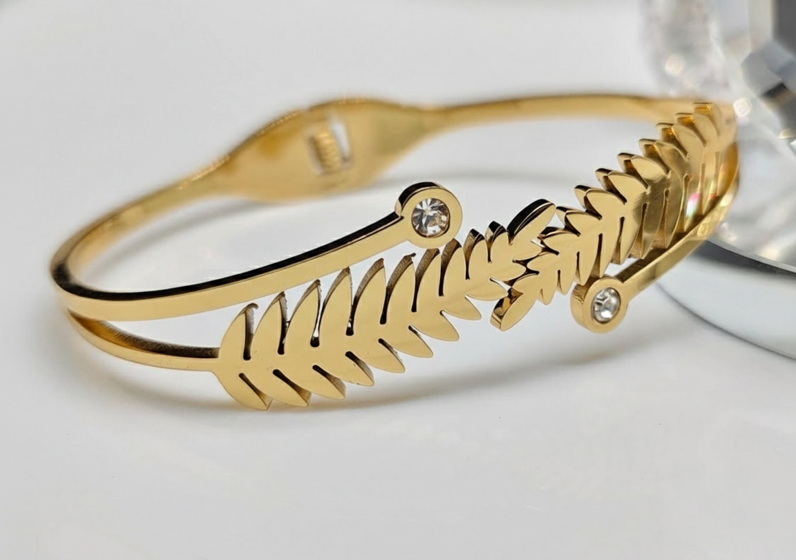 The Gilded Fern: Effortless Elegance & Durability Embrace the tranquility of nature with the Gilded Fern Cuff Bangle. This elegant, adjustable open cuff features a delicate fern leaf motif beautifully detailed on both sides. The design is subtly enhanced by two sparkling cubic zirconia (CZ) stones, adding a sophisticated touch of brilliance to the gold finish. Crafted for Forever Wear: Supreme Quality: Made with durable 18K Gold PVD Plating over stainless steel for a rich, long-lasting color. Life-Proof Luxury: Guaranteed Waterproof, Anti-Tarnish, and Hypoallergenic. Wear it confidently every day—it won't fade, rust, or irritate sensitive skin. Style: A classic piece perfect for the office, formal events, or as a timeless gift.